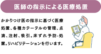 病気や障害を持った人が、住み慣れた地域やご家庭でその人らしく療養生活を送れるように、看護師がご利用者様のご家庭に訪問し、かかりつけ医の指示により病状や療養生活を専門の視点で見守り、適切な判断に基づいたケアとアドバイスを提供いたします。安心して在宅での療養生活が送れるように支援するサーピスです。