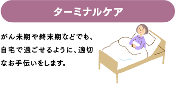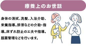 病気や障害を持った人が、住み慣れた地域やご家庭でその人らしく療養生活を送れるように、看護師がご利用者様のご家庭に訪問し、かかりつけ医の指示により病状や療養生活を専門の視点で見守り、適切な判断に基づいたケアとアドバイスを提供いたします。安心して在宅での療養生活が送れるように支援するサーピスです。